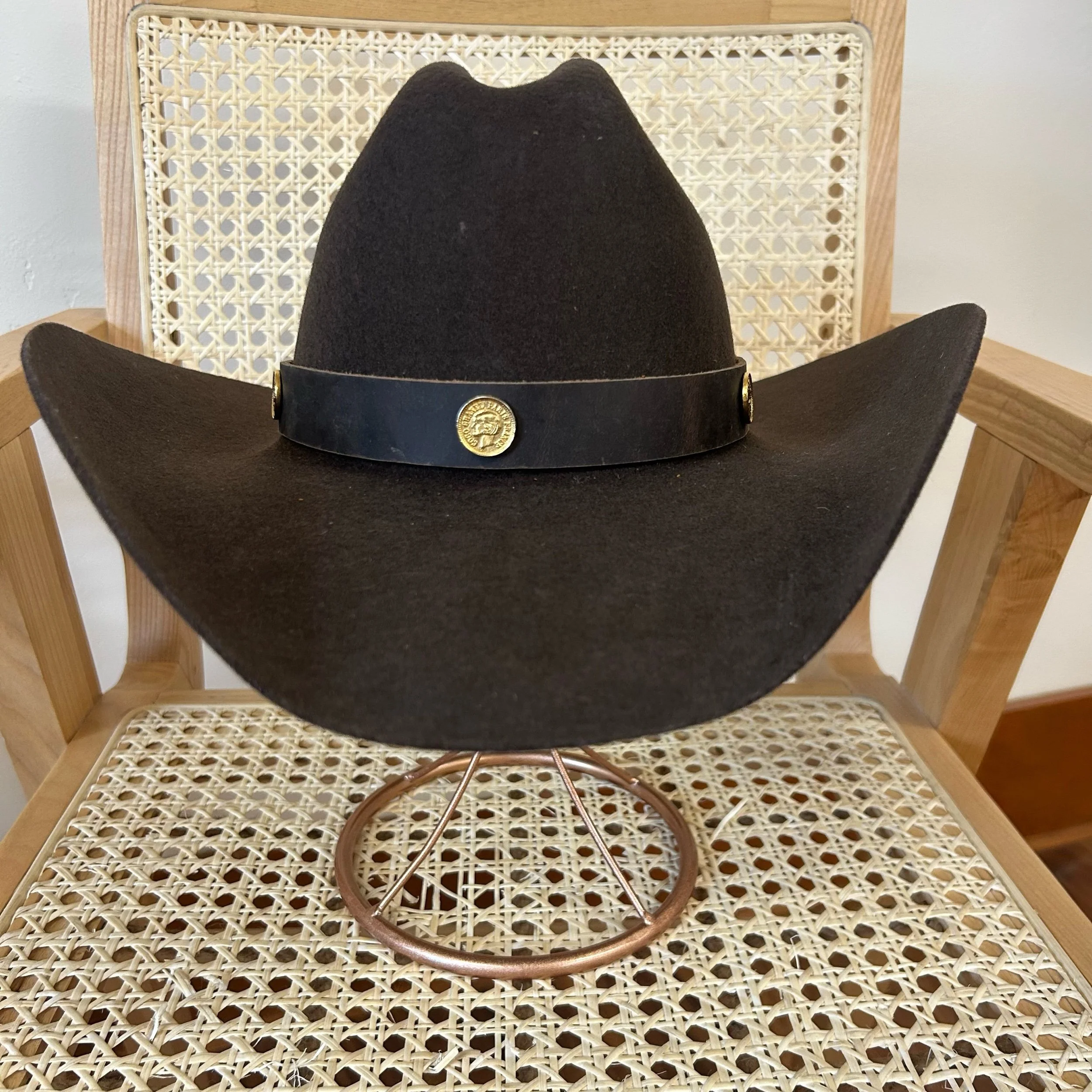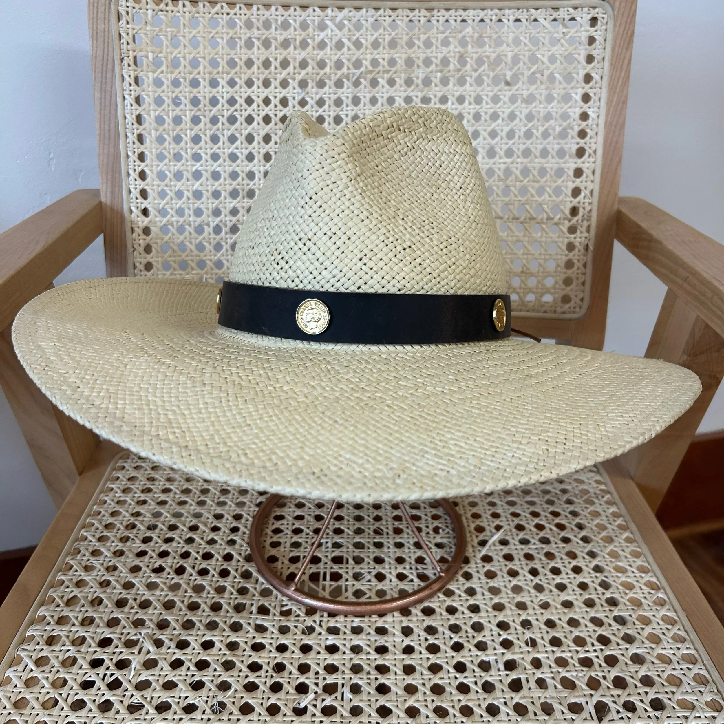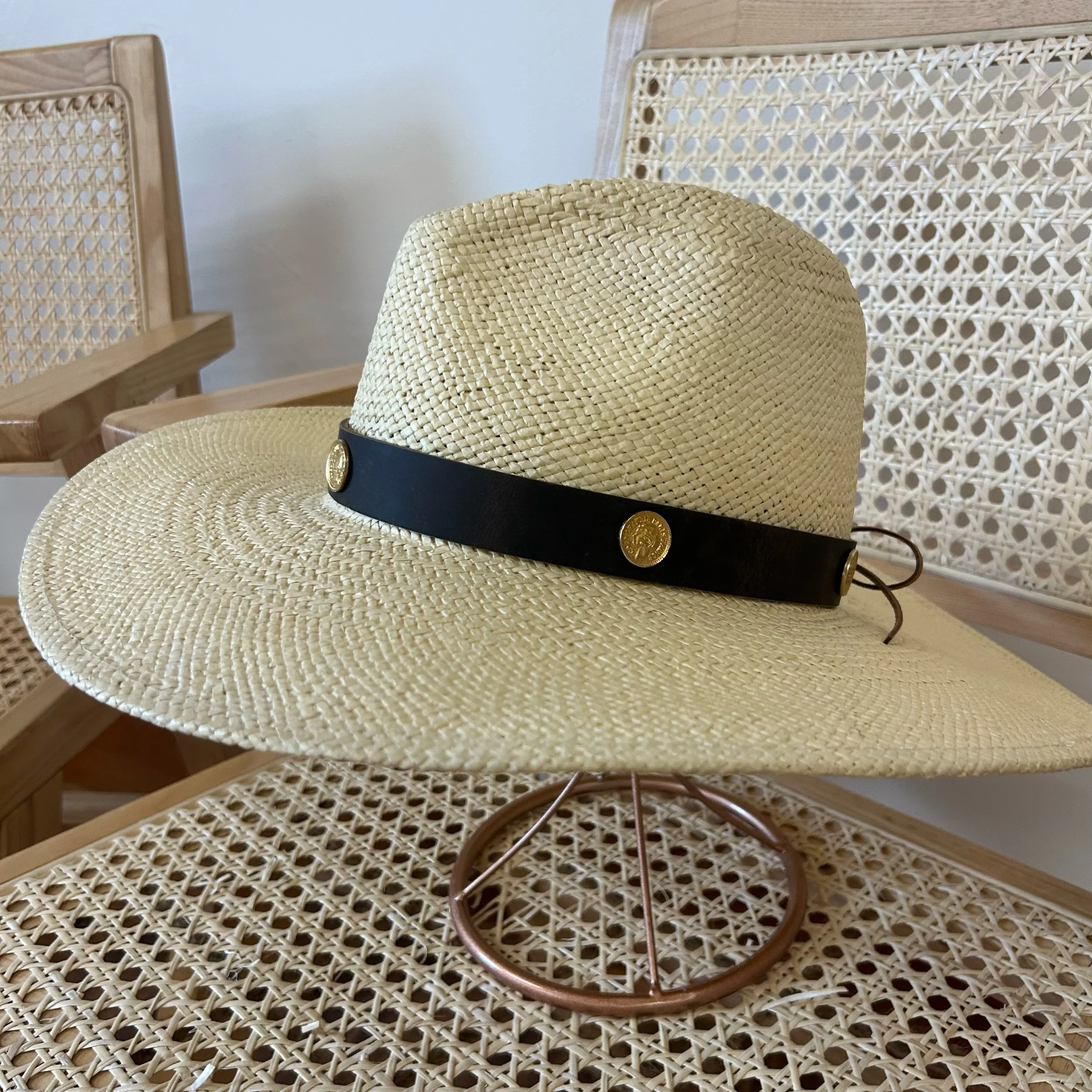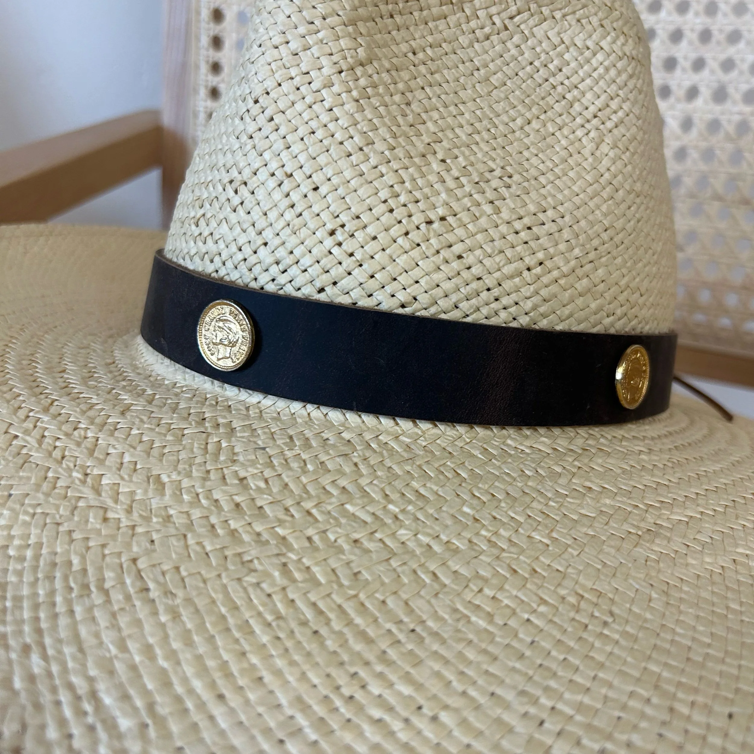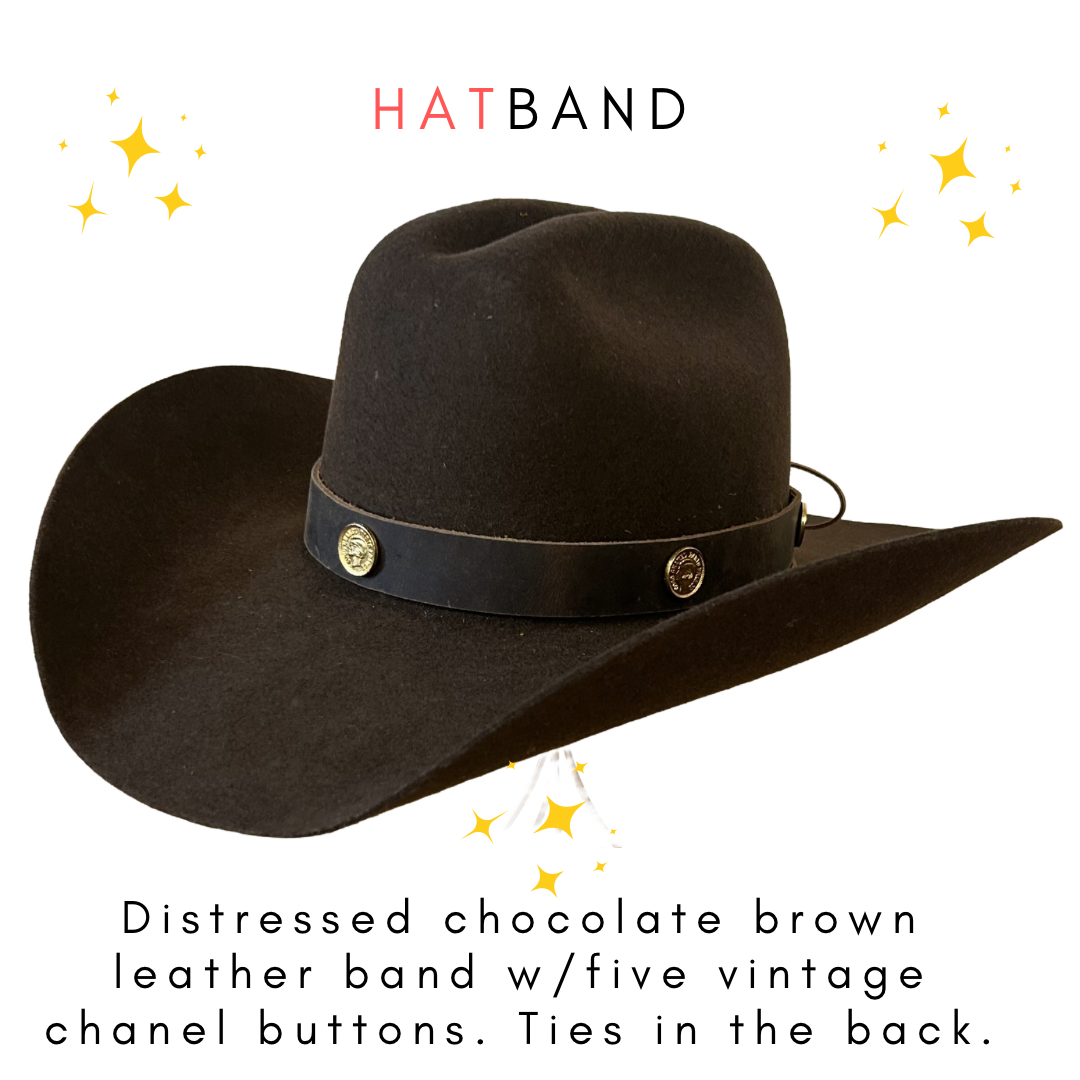 *Chanel Hat Band: Made out of buttons removed from a vintage dress & a distressed dark brown leather band. Ties in the back.